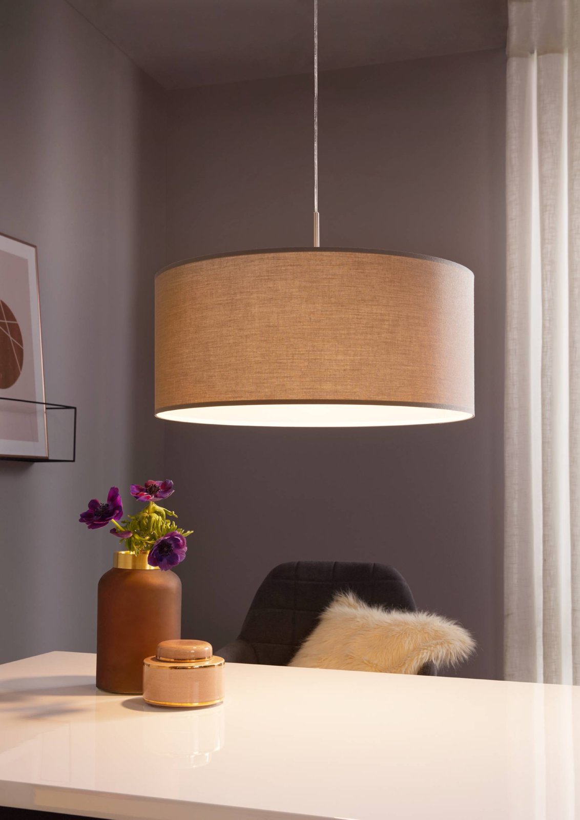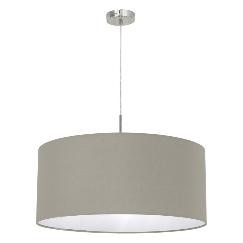 Moderne Leuchten aus Metall in mattem Nickel und Textil in Taupe. Das Pasteri-Set besteht aus Tabletts, Lampen, Kronleuchtern und Wandleuchten, so dass Sie eine komplette Einrichtung erhalten.