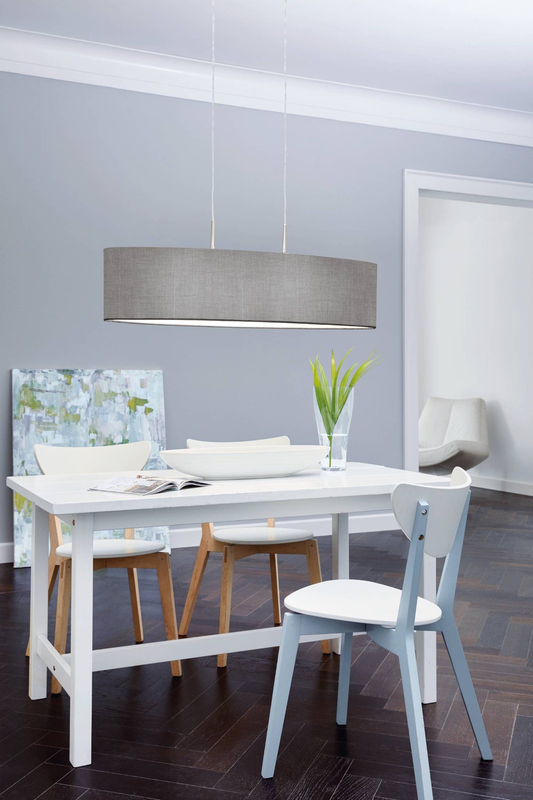 Das Lampenset Pasteri besteht aus Stahl in mattem Nickel und Textil in Grau. Das Set besteht aus Lampen, Kronleuchtern und Wandleuchten, so dass Sie ein komplettes Interieur schön gestalten können. |