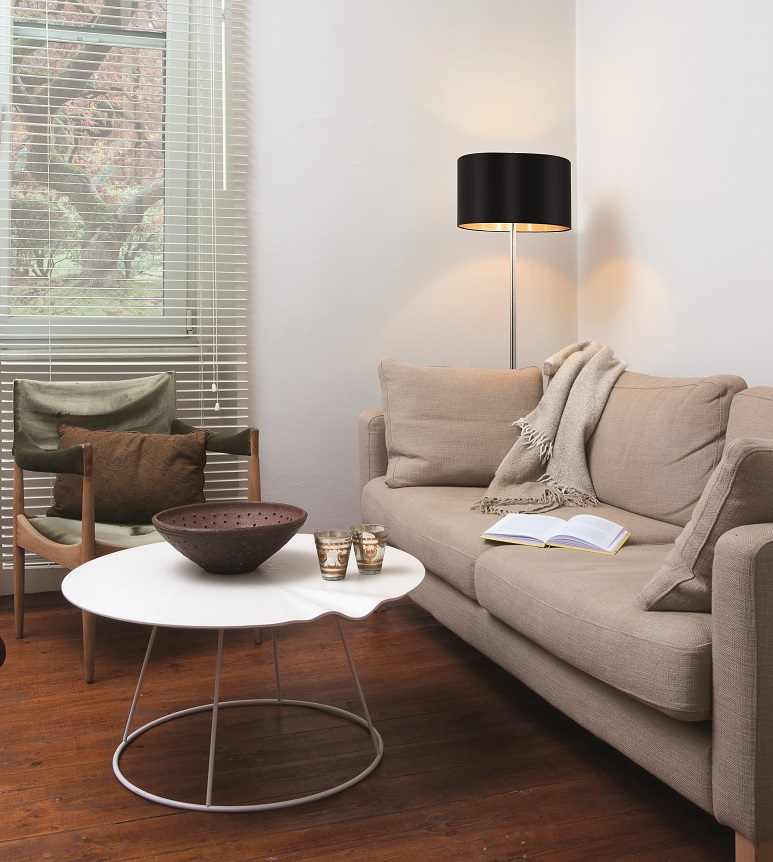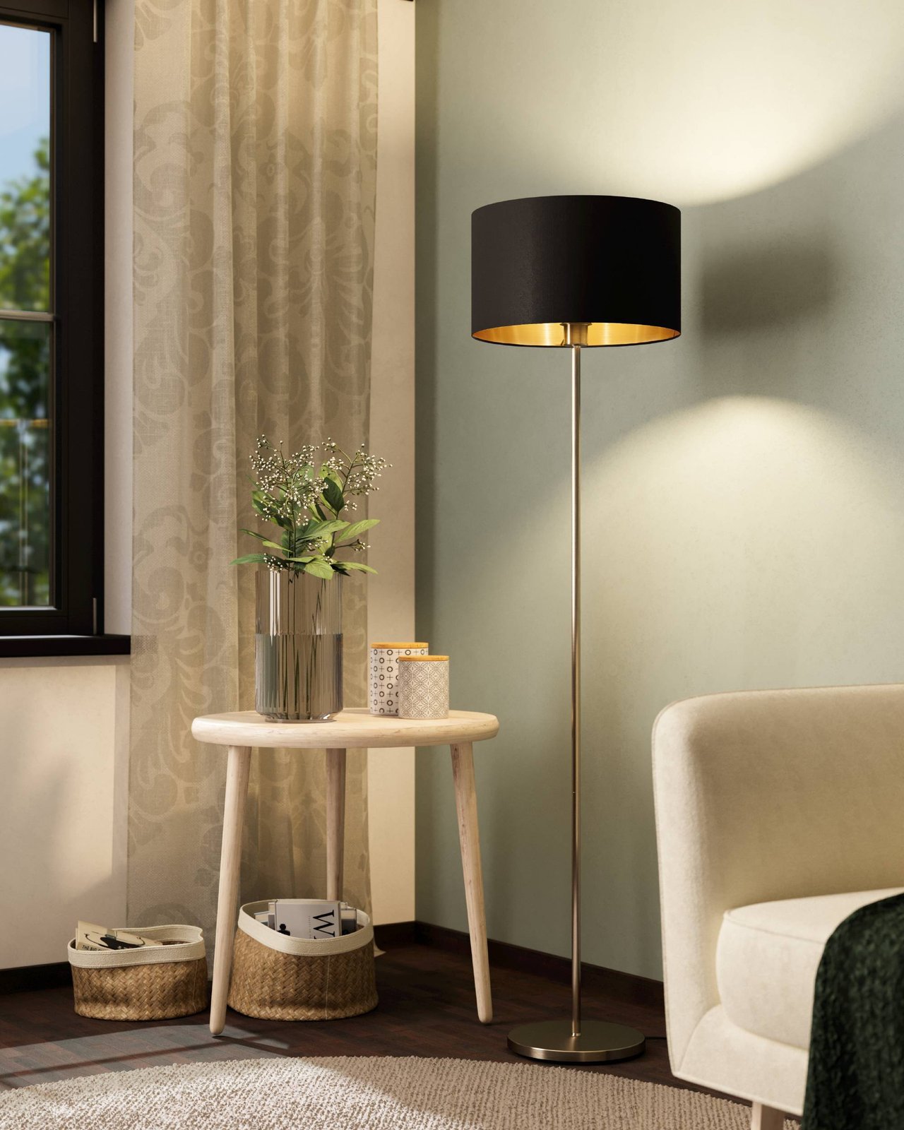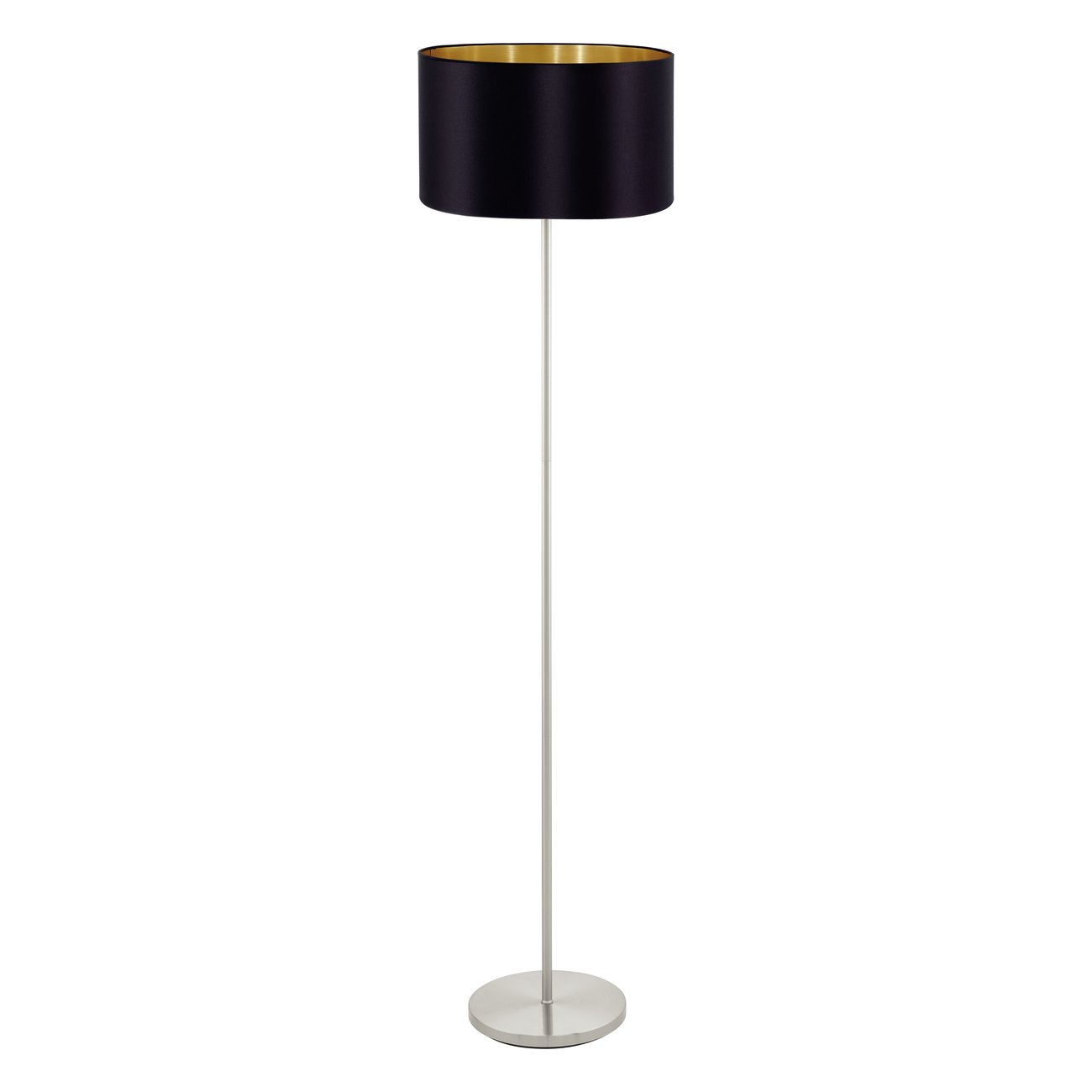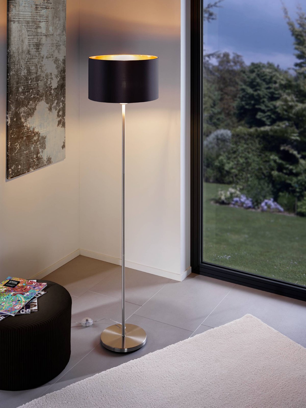 Maserlo sind Lampen in modernem Design. Sie bestehen aus Stahl in der Farbe Mattnickel und der Lampenschirm ist aus Textil, innen goldfarben und außen schwarz. |