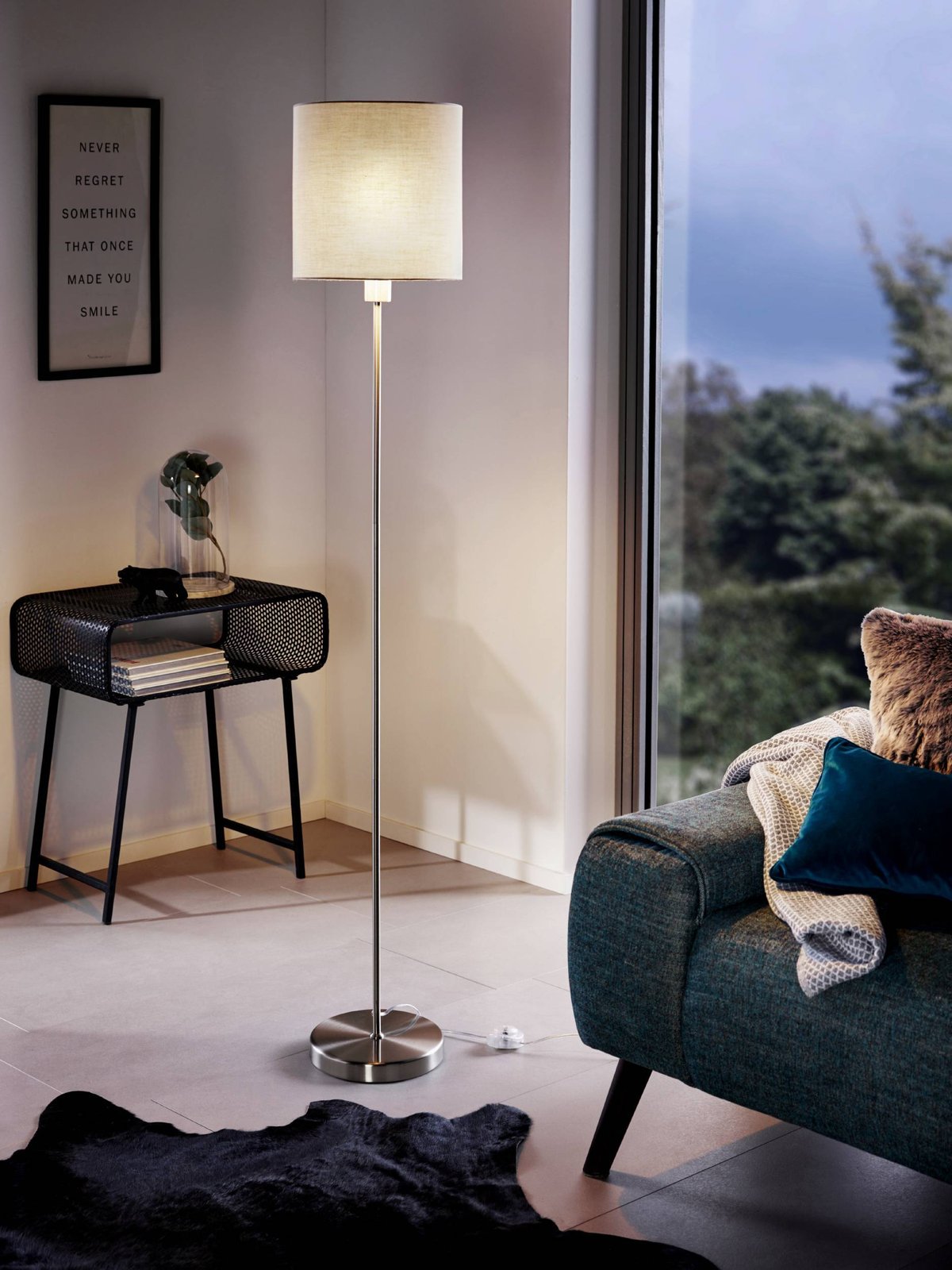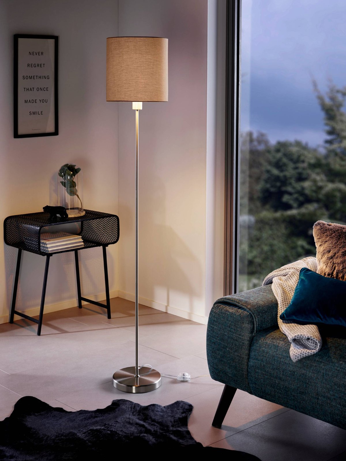 Moderne Leuchten aus Metall in mattem Nickel und Textil in Taupe. Das Pasteri-Set besteht aus Tabletts, Lampen, Kronleuchtern und Wandleuchten, so dass Sie eine komplette Einrichtung erhalten.