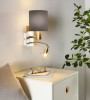 Das moderne Leuchtenset besteht aus Metall in Nickel matt und der Schirm ist aus Textil in Braun-Anthrazit.
