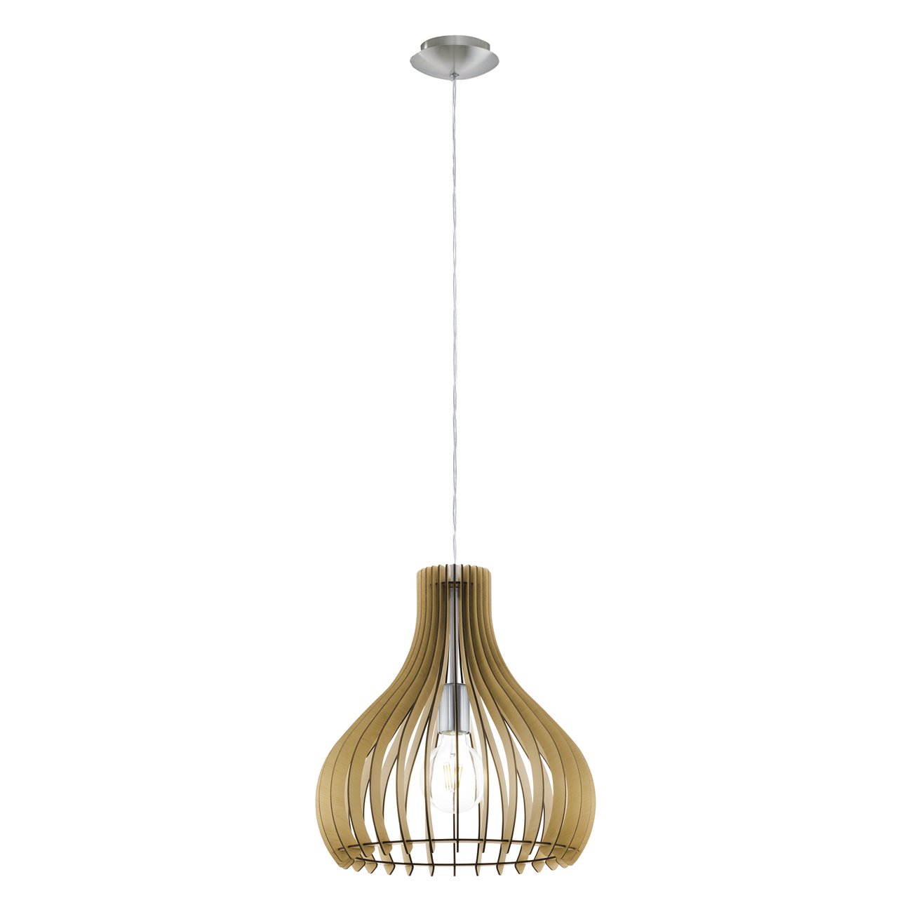 Moderne Pendelleuchten geeignet für Wohnzimmer, Küche, Esszimmer, aber auch Schlaf- und Kinderzimmer. Sie bestehen aus Stahl in der Farbe Mattnickel und aus Holzlatten in der Farbe Ahorn. |