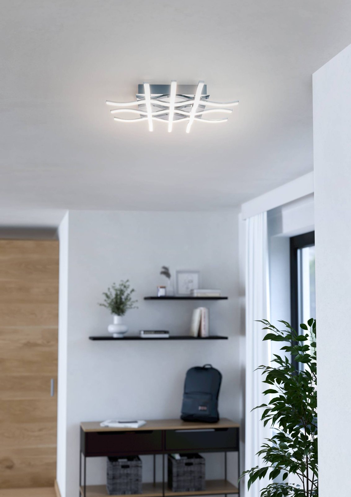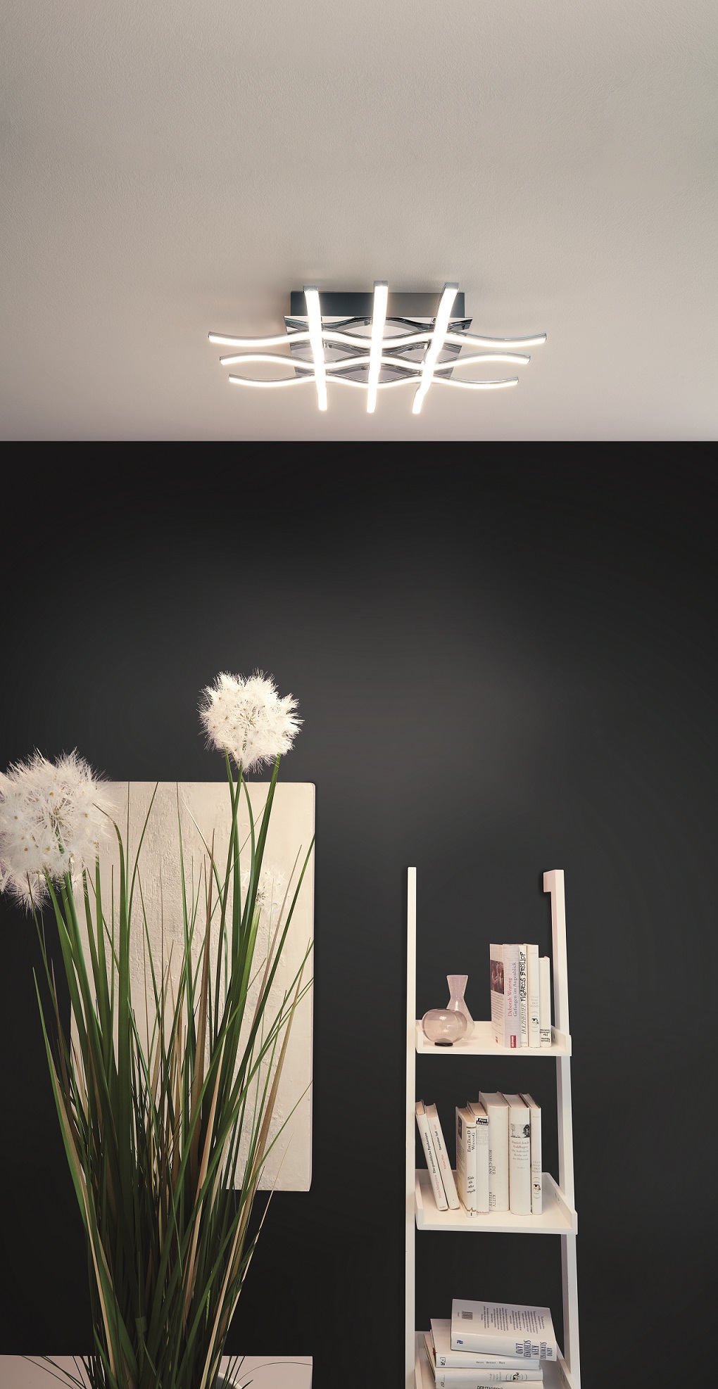 Moderne Deckenleuchten aus chromfarbenem Stahl und weißem Kunststoff. Im eingeschalteten Zustand wirkt die Lampe luxuriös und wird im Wohnzimmer, Schlafzimmer, aber auch im Flur zum Blickfang. Sie leuchtet in einem warmweißen Farbton und ist nicht dimmbar.