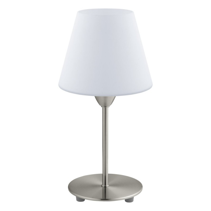 Eine schlichte Lampe aus mattnickelfarbenem Stahl und weißem Opalglas. |